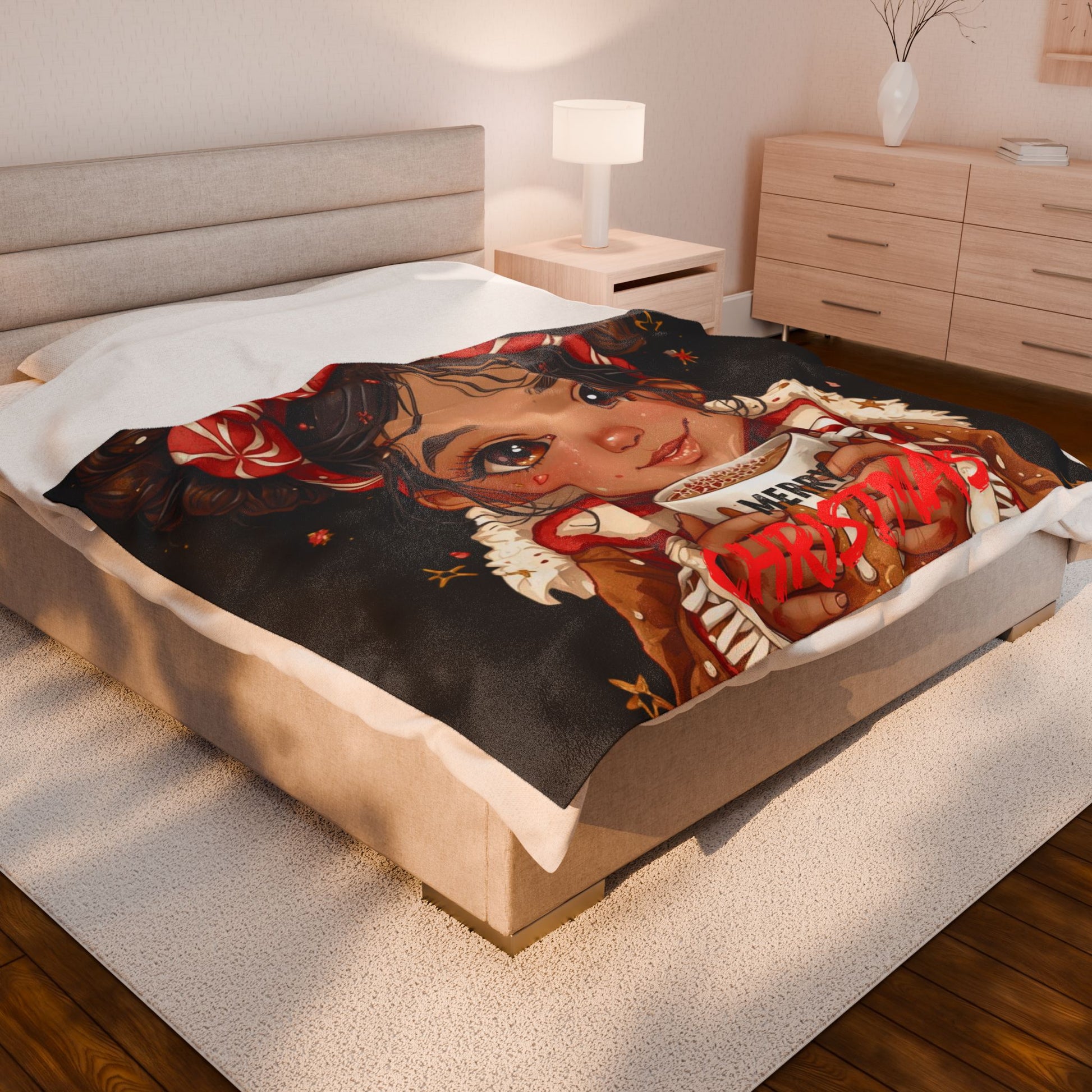 Holiday Plush Blanket — Cute Girl Holding ‘Merry Christmas’ Cocoa Velveteen Throw